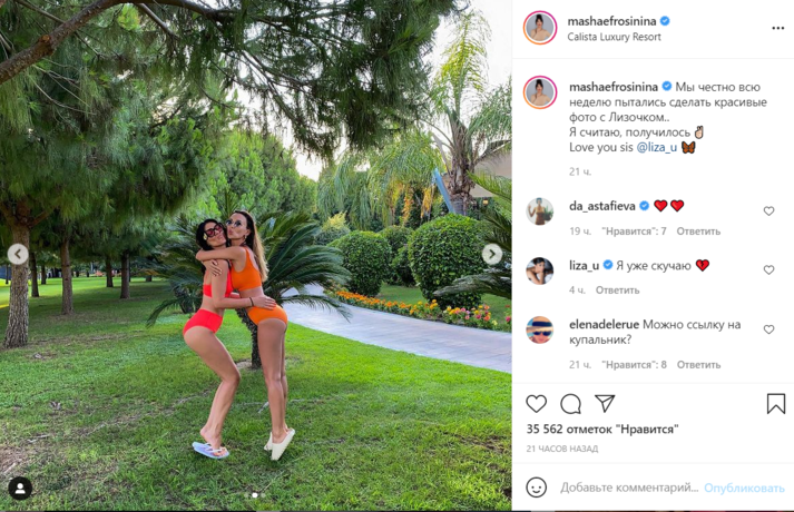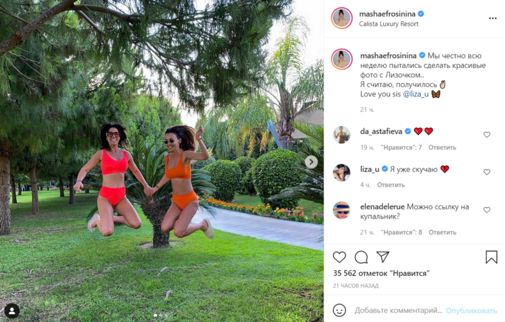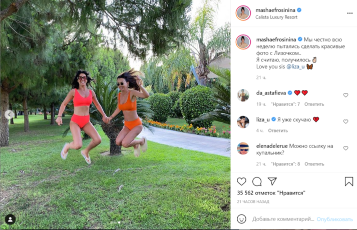 Не утратила случай Ефросинина и посоревноваться с сестрой фигурами в купальниках. На странице в Instagram Мария разместила снимки, где они с Лизой обнимаются и весело прыгают. Маша была в коралловом купальнике, ее сестра - в оранжевом.