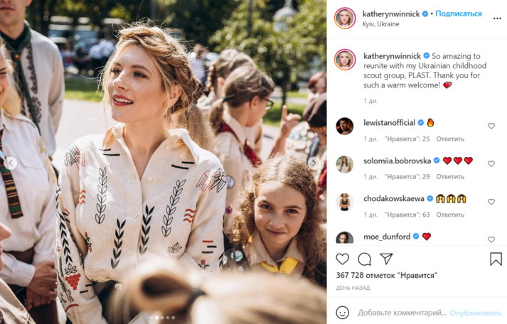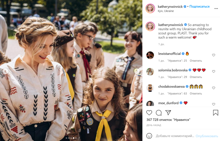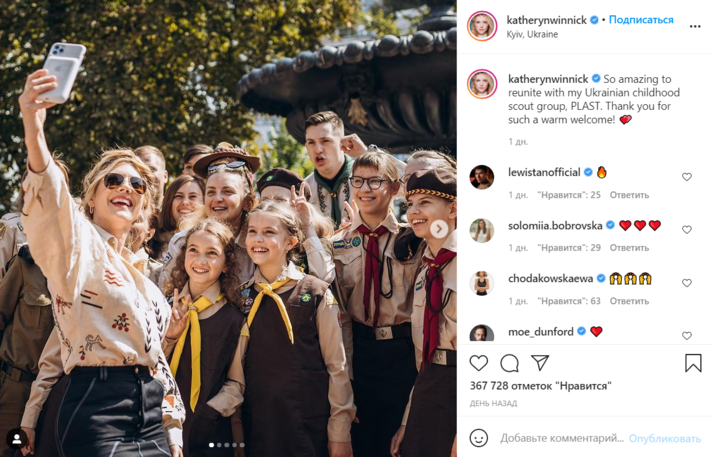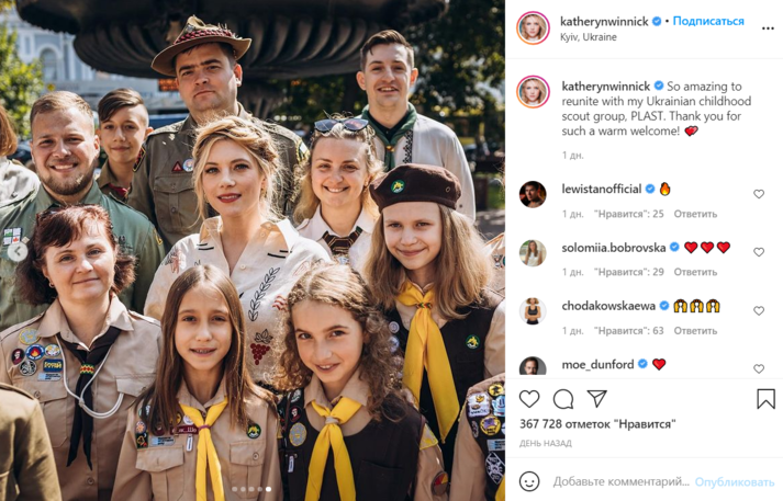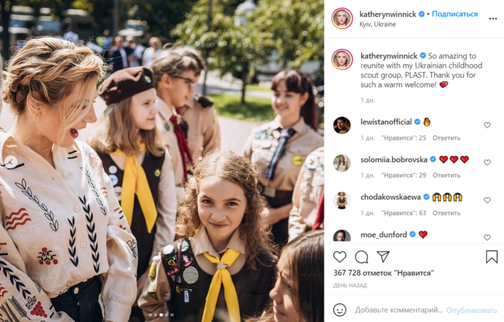 Соответствующие фото она опубликовала на личной странице в Instagram. «Так замечательно воссоединиться со своей украинской детской скаутской группой «Пласт». Спасибо за такой теплый прием!», – написала Кэтрин в посте.