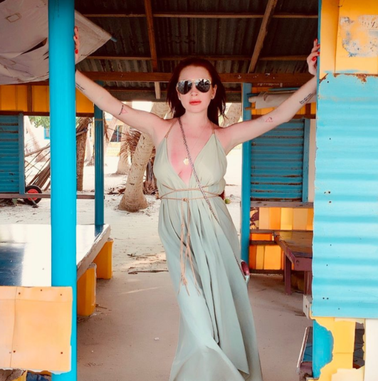 На одном из фото рыжеволосая актриса предстала в легком длинном платье фисташкового цвета. Открытое декольте не смогло скрыть покраснений на теле звезды. Тропическое солнце не пощадило тонкую кожу.