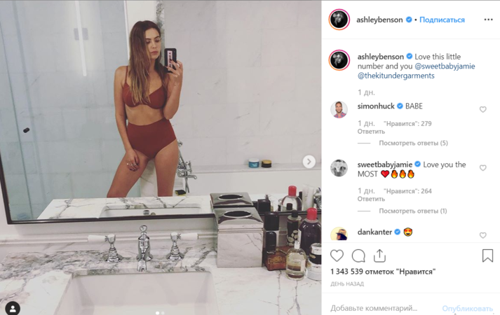 Эшли Бенсон поделилась с поклонниками горячими снимками. Возлюбленная самой востребованной британской модели Кары Делевинь похвасталась комплектом нижнего белья. Эшли надела бра и трусы-макси глубокого красного цвета и сфотографировала своем отражение в зеркале ванной комнаты. Актриса нанесла яркий макияж с акцентом на губы и распустила влажные волосы.