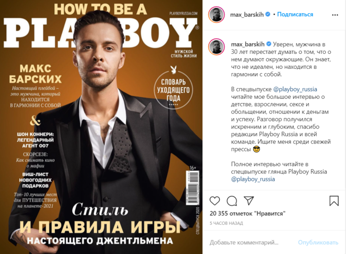 Певец Макс Барских стал героем специального выпуска российского эротического журнала Playboy. Об этом он сообщил в своем Инстаграме.