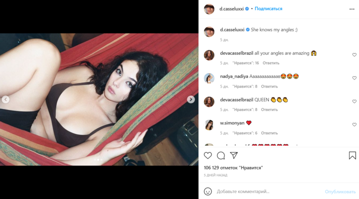 «Соперницей» 57-летней Моники стала ее собственная дочь Дева, рожденная в браке с Касселем. Девушке недавно исполнилось 17, но многие уже считают, что внешне она превзошла свою мать. Красавица поделилась в Инстаграме снимками, показав, насколько хороша: чувственный рот, выразительные глаза, роскошные кудри и эффектная фигура – Дева точно взяла от родителей все самое лучшее.