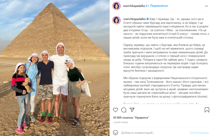 Телеведущая Маричка Падалко с мужем и тремя детьми отдыхают в Египте. «Каир и пирамиды – то, ради чего мы в Египте выбрали для отдыха именно Хургаду, а не Шарм. И эта экскурсия превысила наши ожидания». Хотя, как признается Маричка, поездка была утомительной. «Отправились из гостиницы в час ночи и вернулись обратно только через сутки», – написала телеведущая в своем Инстаграм. Добираться в одну сторону пришлось около семи часов.
