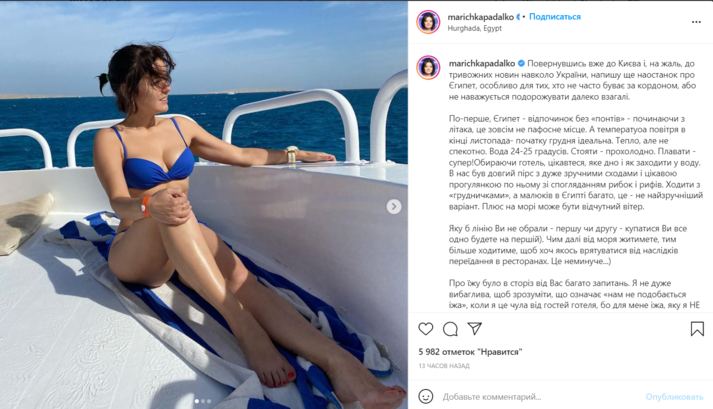 Телезвезда поделилась, что, несмотря на негативные отзывы других гостей о еде, ей и родным питание понравилось. Также ведущая посоветовала подписчикам взять хотя бы одну экскурсию, чтобы «не одичать на ежедневном маршруте «ресторан-море-комната-ресторан». Так, семье Марички понравилось путешествие на корабле для погружения с аквалангами и масками.