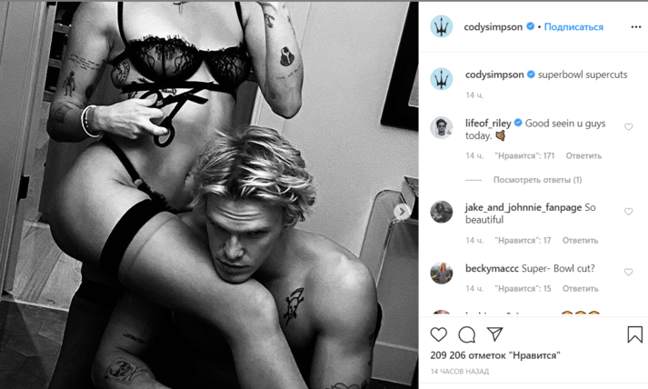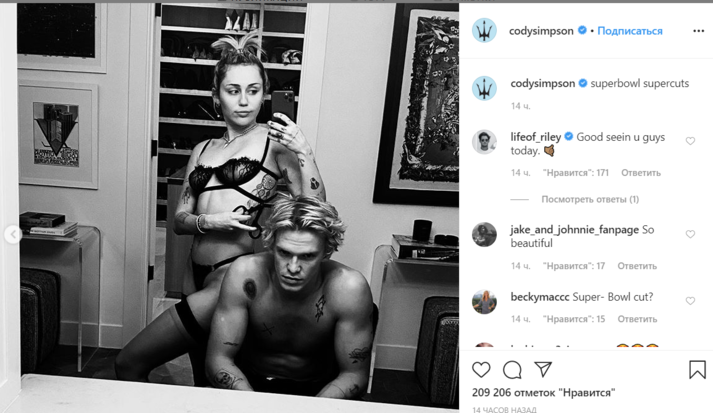 Коди отметил, что многие знаменитости в это время посетили Супербоул. Симпсон и Сайрус не пошли на светское мероприятие и совсем об этом не жалеют. «Пока вы на супер-крутом Суперкубке, мы делаем супер-крутые снимки», — написал артист.