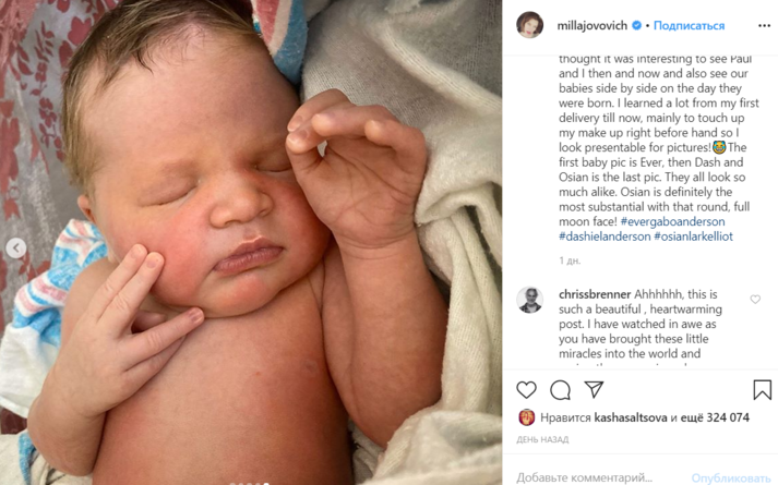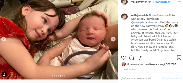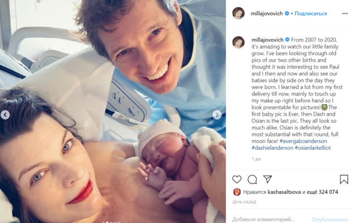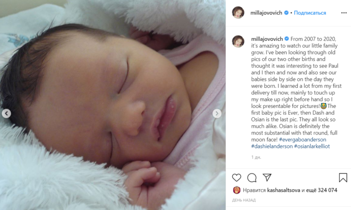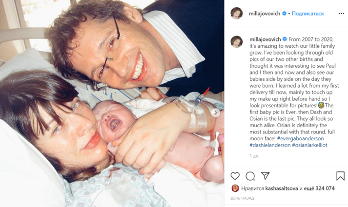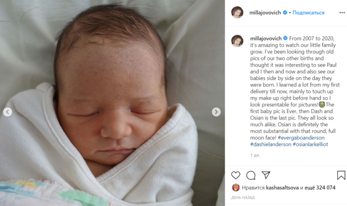 Йовович разоткровенничалась с фанатами, которые продолжают поздравлять ее с пополнением в семье. «С 2007-го по 2020 год удивительно наблюдать, как растет наша маленькая семья. Я просматривала старые фотографии старших детей и подумала, что было бы интересно увидеть нас с Полом тогда и сейчас, увидеть наших дочерей рядом в день их рождения. Я многому научилась с того момента, как стала мамой, знаю, как быстро подправить свой макияж, чтобы презентабельно выглядеть на фотографии!» — отметила голливудская звезда.