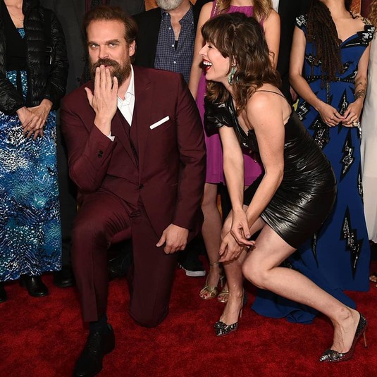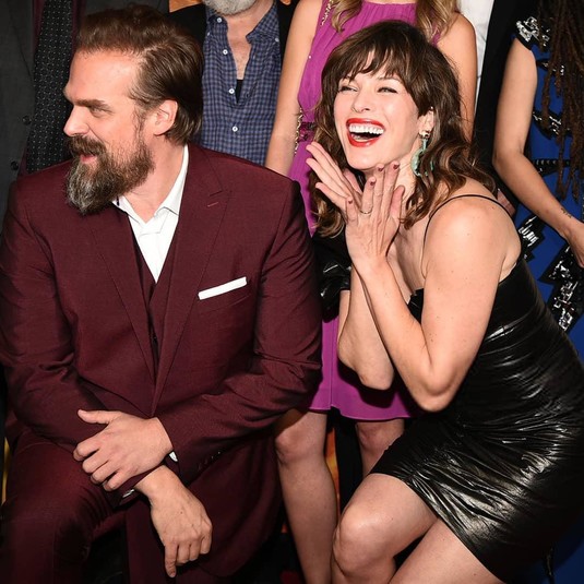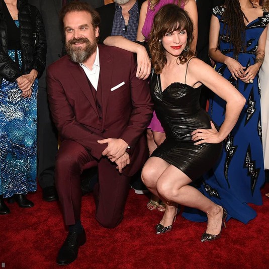 На предпоказе «Хеллбоя» Милла пришла в явно приподнятом настроении: она с удовольствием позировала репортерам, улыбалась и много шутила со своими коллегами по площадке.