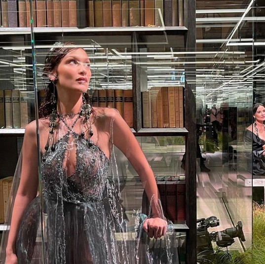 Мероприятие состоялось в среду, 27 января, во время недели моды в Париже. 24-летняя манекенщица вышла на подиум в длинном вечернем платье из полупрозрачной ткани серого цвета, через которую просвечивается грудь. Кроме того, наряд оформлен каплевидным вырезом в зоне декольте.