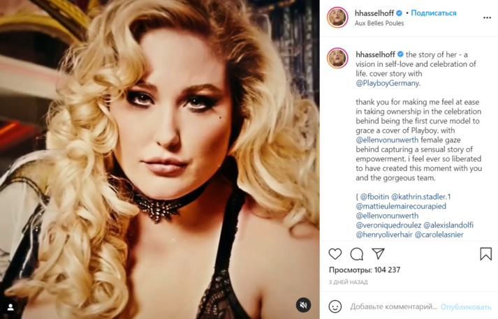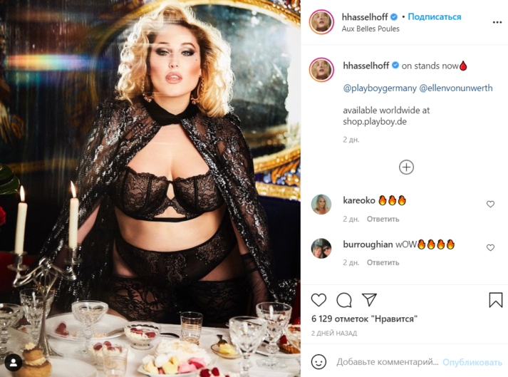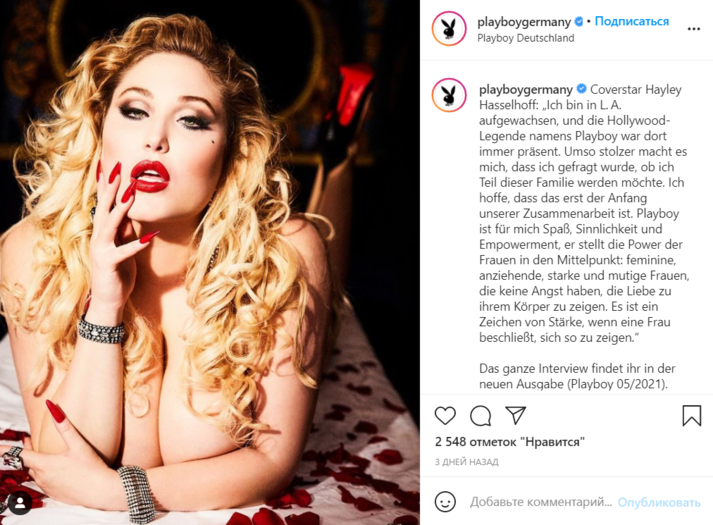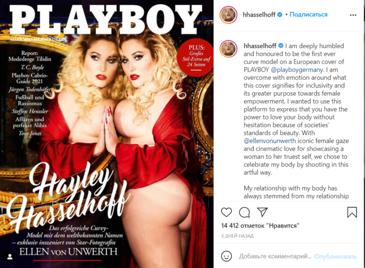 Актриса Хейли Хассельхофф стала первой плюс-сайз-моделью, попавшей на обложку немецкой версии журнала Playboy, и вызвала критику в соцсетях. Соответствующие комментарии появились в Twitter.