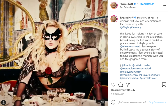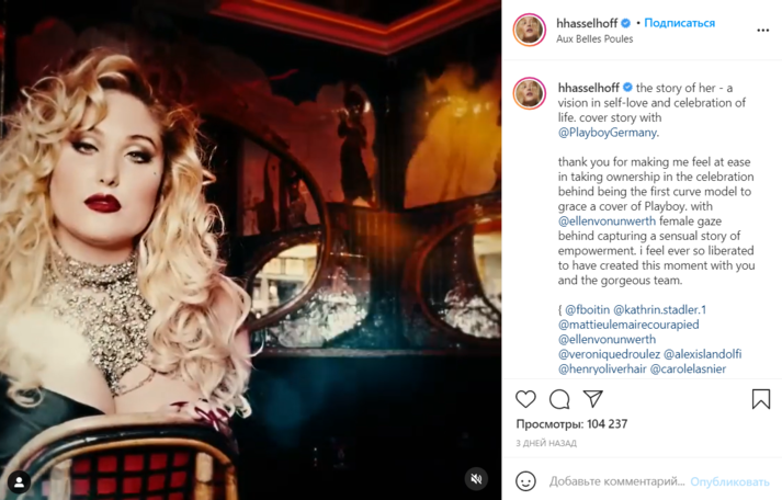 По словам Хассельхофф, она счастлива продвигать идею инклюзивности в модельной индустрии в массы. «Я использовала такой авторитетный журнал, чтобы призвать женщин любить свое тело, не опираясь на принятые в обществе стандарты красоты», — пояснила актриса.