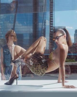 Для съемки стилисты выбрали несколько разных образов, например, небесно-голубое виниловое платье, блестящее фиолетовое платье из паеток, укороченный свитер и плиссированная юбку. К слову, чуть позже эту конструкцию перенесли на открытую террасу, где продолжили съемку под лучами солнца.