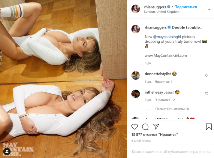 Ратаковски поделилась снимком в Instagram, на котором она запечатлена в облегающем черном топе с глубоким декольте. В то же время британская манекенщица Садген снялась в белом обнажающем грудь боди, лежа на полу.