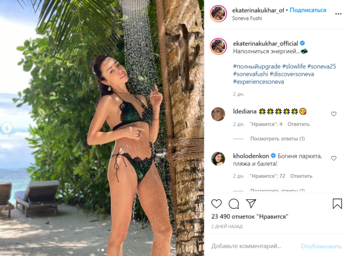 Прима-балерина национальной оперы Украины Екатерина Кухар продолжает делиться фотографиями с отдыха на Мальдивах.