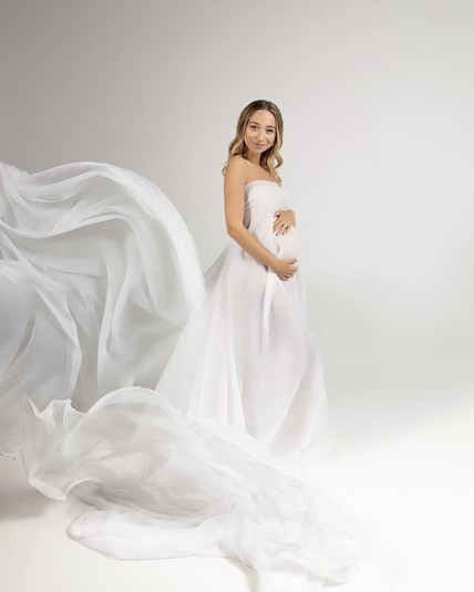 Для съемок избранница звезды выбрала романтическое белое платье со шлейфом и аксессуары. Также девушка сделала легкий макияж. Екатерина нежно обнимала заметно подросший животик.