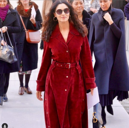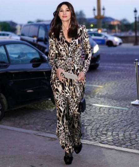 Для званого ужина французского издания Madame Figaro в Париже кинодива выбрала шелковое леопардовое платье в пол с глубоким декольте и высоким вырезом на бедре. Комплект актриса дополнила черными лодочками и темным клатчем. Неожиданный порыв ветра внес свою лепту и открыл зрителям и другие подробности ее образа.