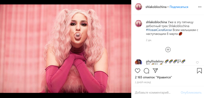 Скандальная украинская певица Maruv сообщила поклонникам, что в скором времени появится артистка Shlakoblochina. «Уже в эту пятницу! Всем малышкам, с наступающим 8 марта», - написала артистка.