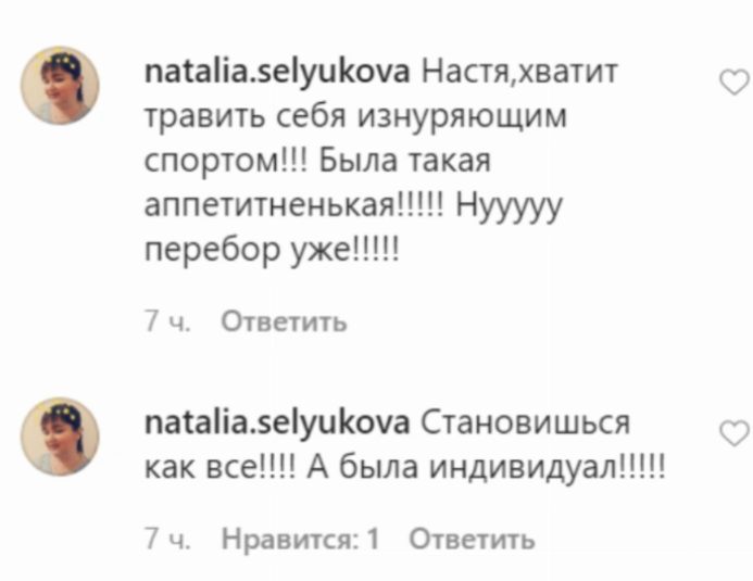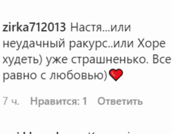 «А что с лицом?», «Это… выражение лица», «Это ужас, зачем так худеть?», «Настя…или неудачный ракурс… или хоре худеть, уже страшненько», «Была такая аппетитненькая!!!!! Нууууу перебор уже!!!!!», «Сухая…», «Становишься как все!!!! А была индивидуал!!!!!» — можно увидеть в Сети.