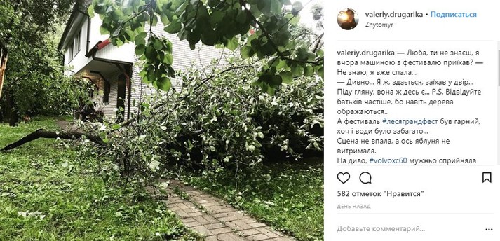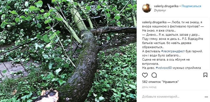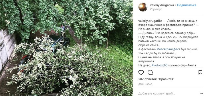 По словам музыканта, по дороге с фестиваля Lesia Grand Fest, который проходил на Житомирщине, он заехал навестить родителей. Утром Валерий обнаружил, что на его машину упала большое дерево.