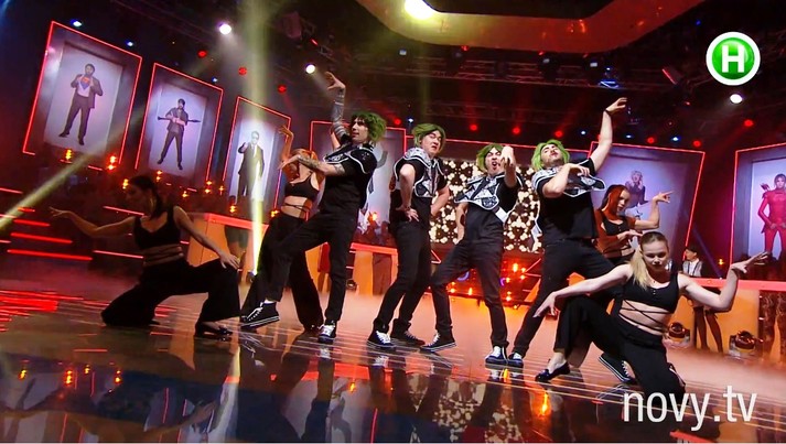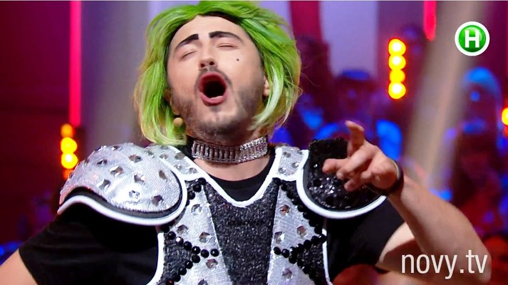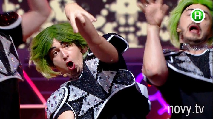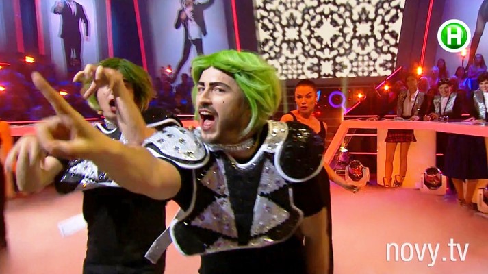 Зеленые волосы, подведенные брови, красные губы. Спорим, такими вы Сергея Притулу, Дмитрия Шурова, Евгения Кошевого и Костю Боровского еще не видели? Ровно на одну песню в парней вселился дух Lady Gaga. А все для того, чтобы выиграть в финальном конкурсе шоу «Хто зверху?».