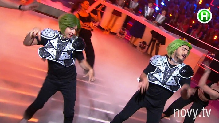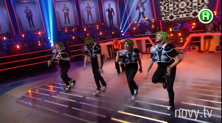 Мужской команде выпало пародировать Lady Gaga, поющую хит Bad Romance, женской – корейского рэпера Psy с песней Gentleman. И парни, и девушки старались вовсю! Если мужчин в образе Lady Gaga еще можно было идентифицировать, то девочки слились в единого Psy. В этом им помогли очки в серебристой оправе и одинаковые черные парики. Попробуй пойми, кто за всем этим скрывается: Настя Каменских, Леся Никитюк, Даша Коломиец или актриса Катерина Кистень.