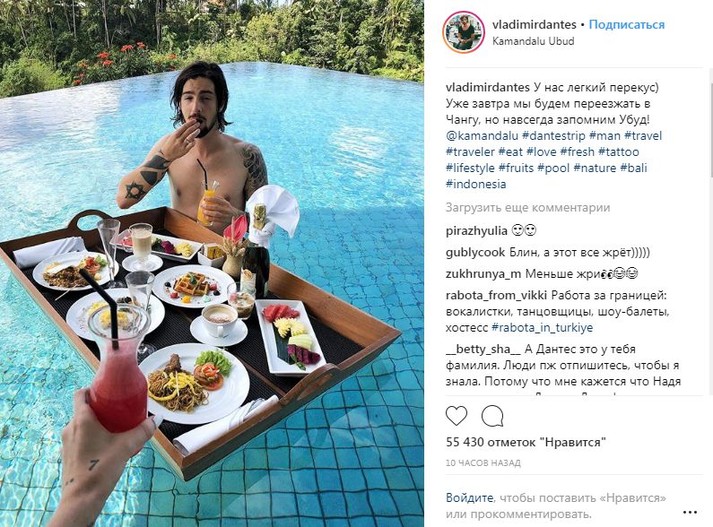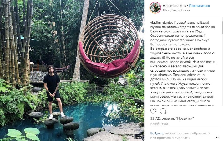 «Нужно понимать,когда ты первый раз на Бали не стоит сразу мчать в Убуд. Особенно, если ты не прожженный поездками путешественник. Почему? Во-первых тут нет океана. Во-вторых это очень спокойное место для пеших прогулок. А я не очень люблю ходить. Но не путайте все вышесказанное со скукой. Нам всё очень интересно и весело. Кафешки для сыроедов нас восхищают, а люди милые и улыбчивые. Познаем абсолютно другой мир»,- поделился впечатлениями Владимир Дантес.