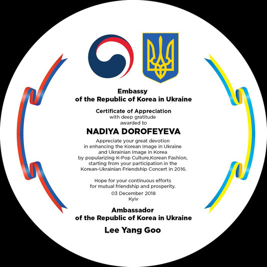 На днях артистка получила специальную награду за вклад в укрепление корейского имиджа в Украине и украинского имиджа в Корее, а также популяризацию k-pop культуры.