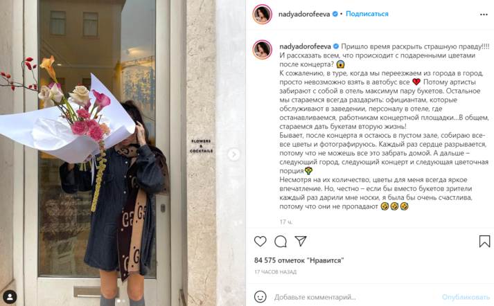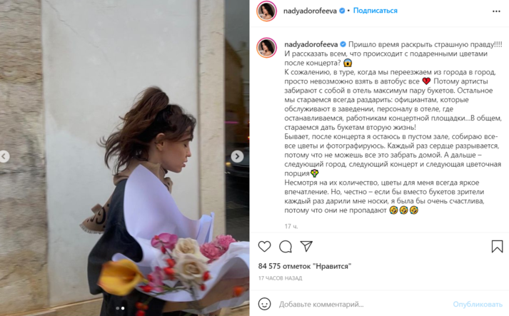 «Каждый раз сердце разрывается, потому что не можешь все это забрать домой. А дальше – следующий город, следующий концерт и следующая цветочная порция», – добавила Надя.