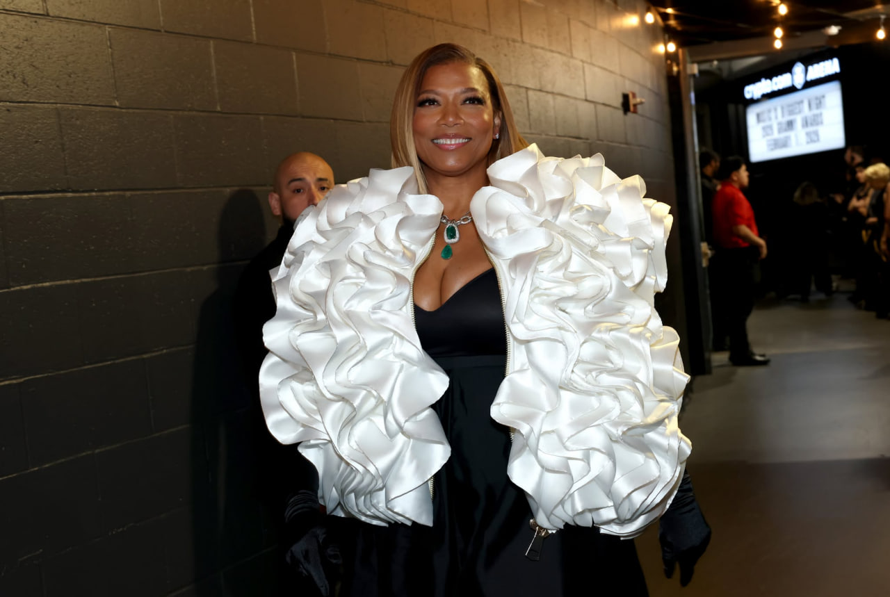 Американська співачка та реперка Квін Латіфа показалася на червоному хіднику у чорній атласній сукні з яскравою білою накидкою. Плечі виконавиці вкрили великі білі рюші, що стали перлиною її образу. Квін Латіфа також стала однієї зі співачок, що виступили на сцені музичної премії.