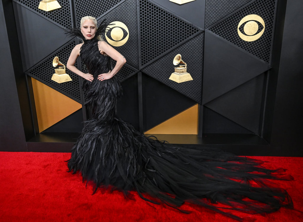 На червоній доріжці Леді Гага позувала у готичній сукні з чорного пір’я, що підкреслює її яскраву та особливу творчість. Сукні з пір'ям мала довгий шлейф та високий комірець, що додав виразності образу Гаги. Співачка зібрала волосся у стриману зачіску та підкреслила свою сукню темним макіяжем.