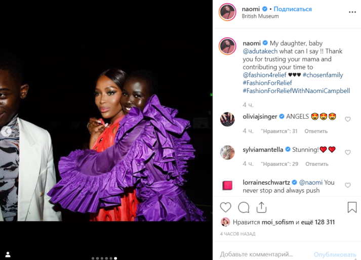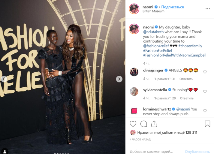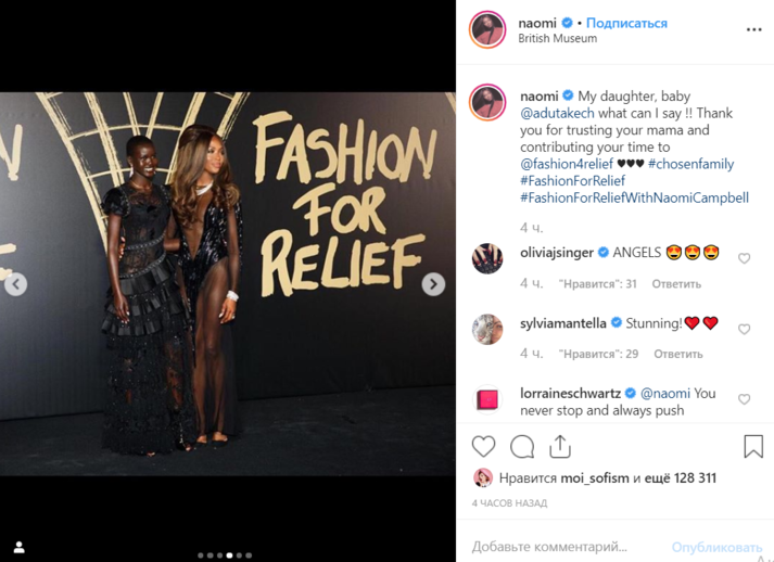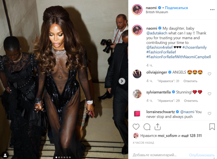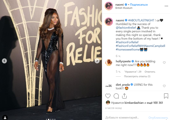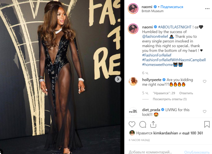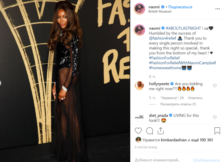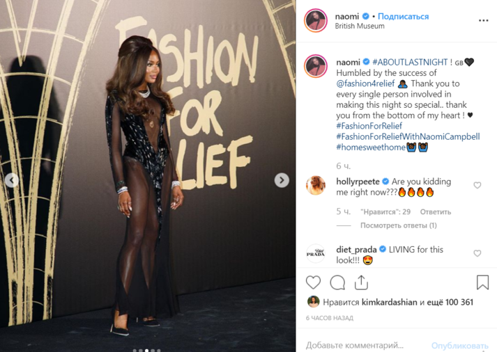 В рамках Лондонской Недели моды 49-летняя Наоми Кэмпбелл приняла участие в традиционном благотворительном показе Fashion For Relief. Наоми появилась перед гостями в эффектном «голом» платье со вставками из черных сияющих пайеток в районе груди и зоны бикини.