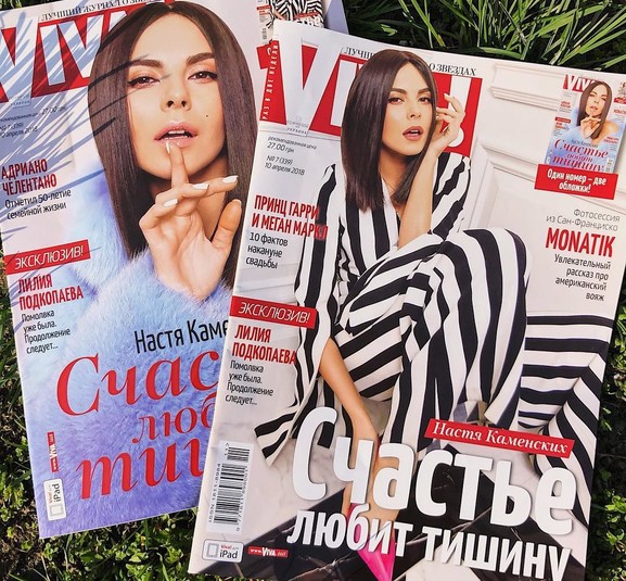 В журнале Viva звезда предстает настолько разной, что на некоторых кадрах ее сложно узнать. Певица примерила пушистое мини-платье, голубую шубку, костюм в черно-белую полоску, колготки в сетку, лимонный тренч и спортивный костюм. Все образы Насти Каменских дополнили ярким макияжем.