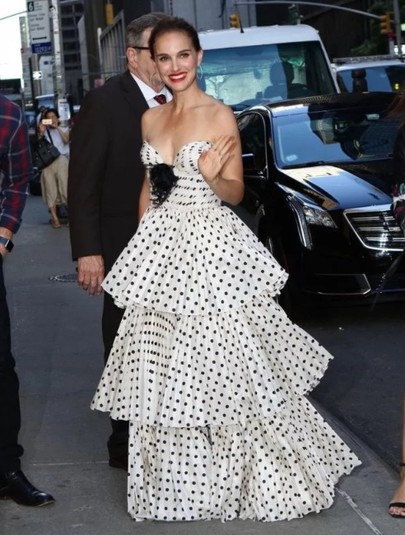 Для премьеры проекта Натали позировала в вечернем платье Miu Miu с принтом в горох. К слову, эксперты назвали этот принт самым модным летом 2018.