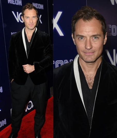 37-летняя актриса неожиданно изменила своему привычному стилю и выбрала для красной дорожки дерзкий образ: босоножки, строгие брюки и жакет от Dior на голое тело. Ее 45-летний коллега по съемкам Джуд Лоу, как всегда, блистал перед фотографами в стильном пиджаке и с фирменным прищуром.