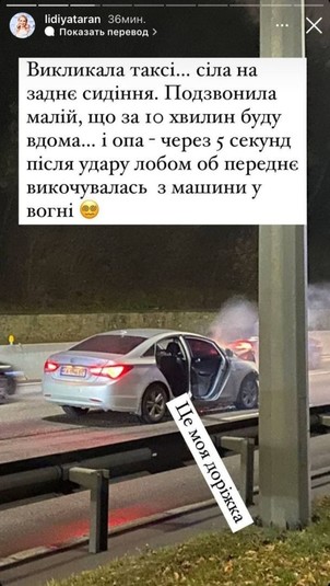 «Вызвала такси... Села на заднее сиденье. Позвонила малой, что через 10 минут буду дома... И опа — через 5 секунд после удара лбом о переднее сиденье выкатываюсь из машины в огне», — рассказала жуткие подробности ведущая.