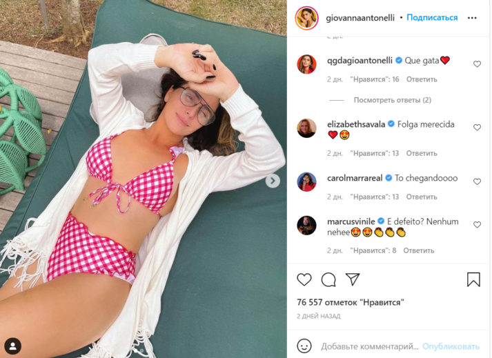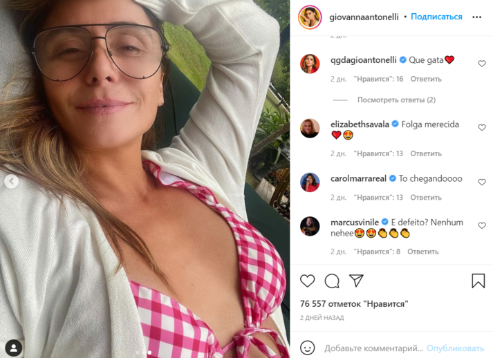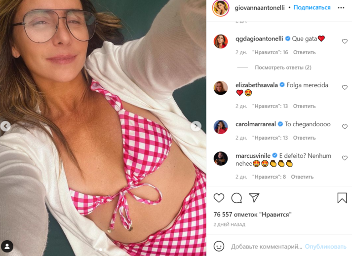 Знаменитая бразильская актриса и звезда сверхпопулярного сериала 2000-х «Клон» Джованна Антонелли в своем Инстаграме похвасталась моложавым видом и точеной фигурой.
