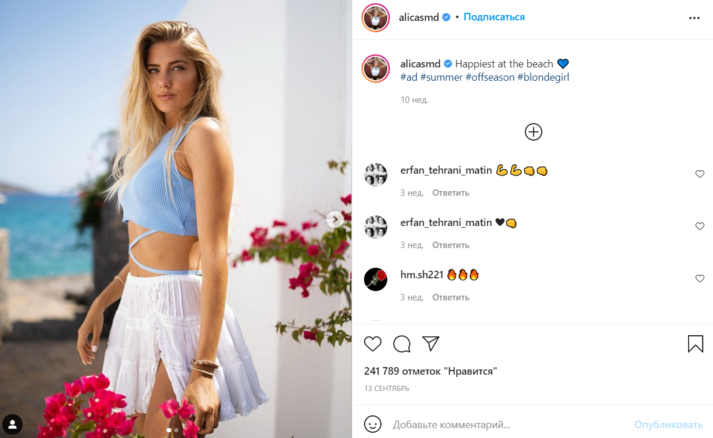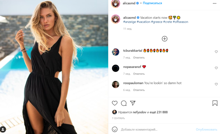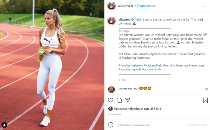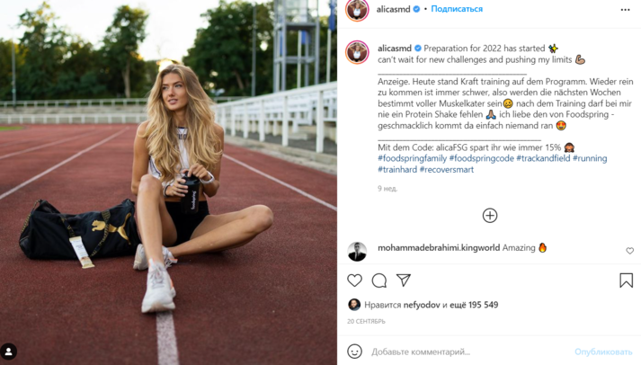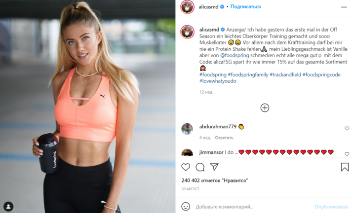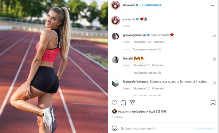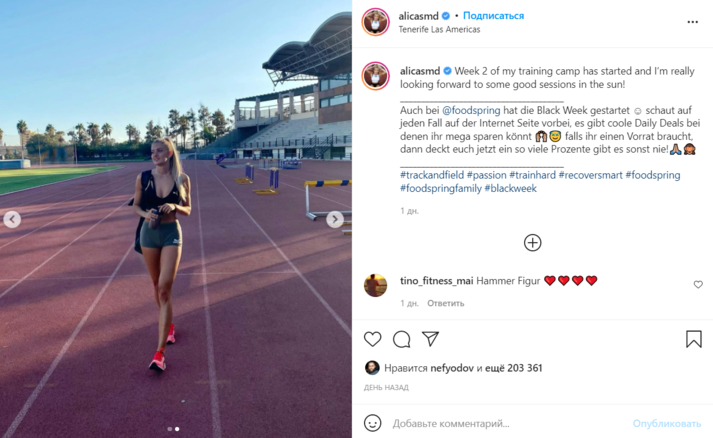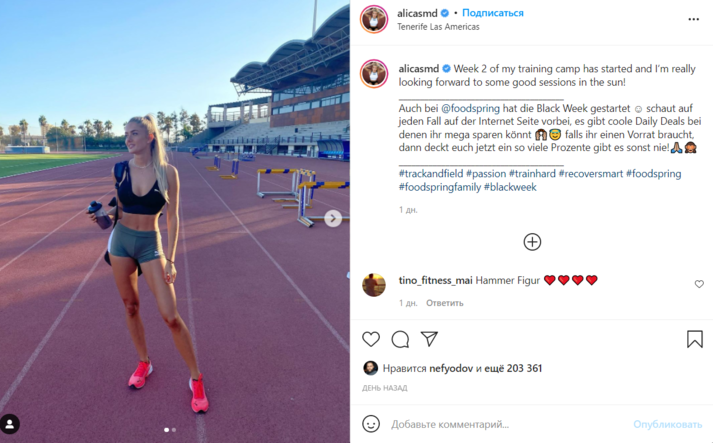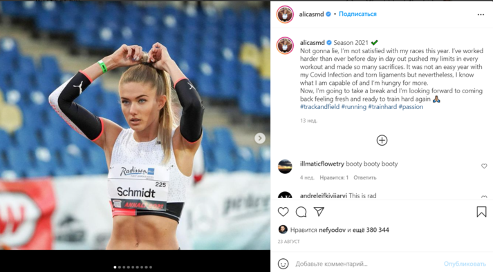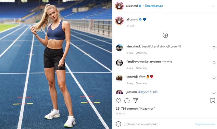 Немецкая бегунья Алиса Шмидт, которую издание Busted Coveragе признало самой сексуальной спортсменкой мира, опубликовала новую фотографию в Instagram.
