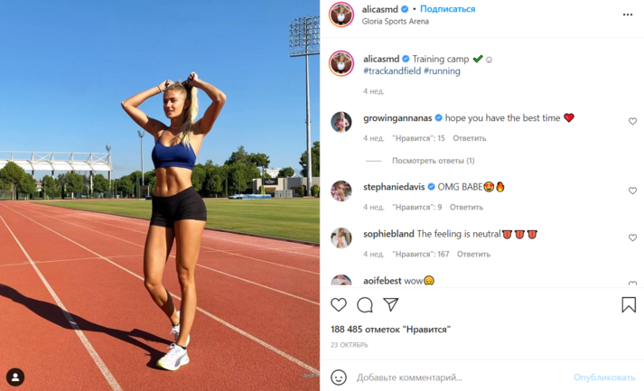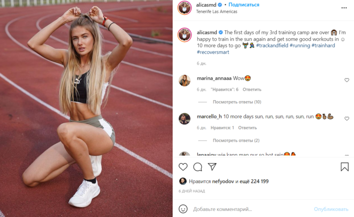 Легкоатлетка попозировала в обтягивающем черном топе с глубоким декольте и коротких зеленых шортах на стадионе на Тенерифе. Она написала, что начинает вторую неделю тренировок, и с нетерпением ждет новых побед. В комментариях пользователи назвали наряд спортсменки восхитительным. Снимок набрал больше 200 тысяч лайков.