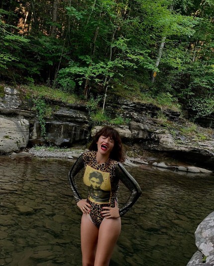 «Один из моих любимых дизайнеров, Кристиан Лакруа, подарил мне этот костюм с моим портретом после того, как я продефилировала в нем примерно в 20-летнем возрасте. И я нашла его! Каким-то образом он сохранился сквозь годы, и мне кажется, что боди выглядит круто», — подписала манекенщица пост, подчеркнув, что у изделия очень эластичная ткань.