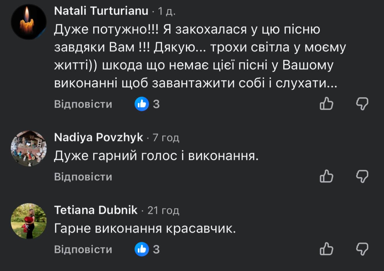 - «Дуже потужно! Я закохалася в цю пісню завдяки Вам!!! Дякую… трохи світла в моєму житті. Шкода, що немає цієї пісні у вашому виконанні, щоб завантажити собі та слухати».