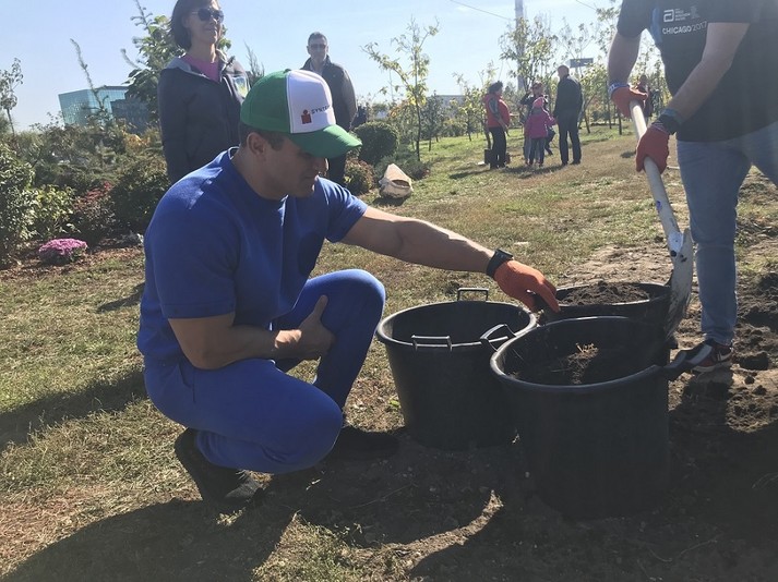 Вместе с собравшимися участниками акции ведущий Нового канала высаживал туи, катальпы и магнолии, носил ведра с землей и удобрениями, а в коротких перерывах – фотографировался с окружившими его детьми и общался с волонтерами.