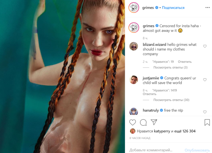 31-летняя Клэр Буше, известная под псевдонимом Граймс, опубликовала кадр, который поднял вокруг себя много шума. Певица предстала на снимке топлес и с заметно округлившимся животом с наложением изображения младенца. Возлюбленная Илона Маска не стала уточнять детали своего интересного положения, а лишь пожаловалась на политику Инстаграма, из-за которой ее предыдущий снимок был заблокирован.