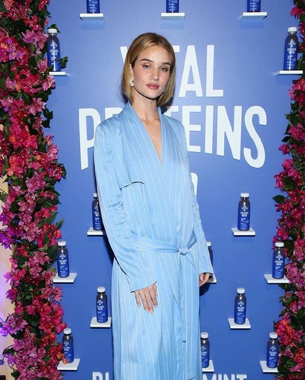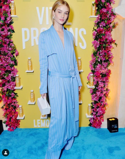 31-летняя скпермодель Рози Хантингтон-Уайтли решила вернуть пижамный стиль в моду. На презентации новой коллагеновой воды от известной фирмы звезда появилась в нежно-голубом халате в тонкую белую полоску и таких же брюках свободного кроя. Наряд был дополнен ремнем-лентой, который Рози, впрочем, не стала туго затягивать, стремясь акцентировать свою тонкую талию, а повязала слегка небрежно.