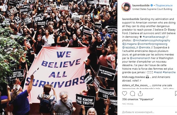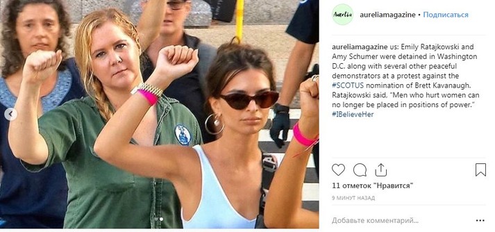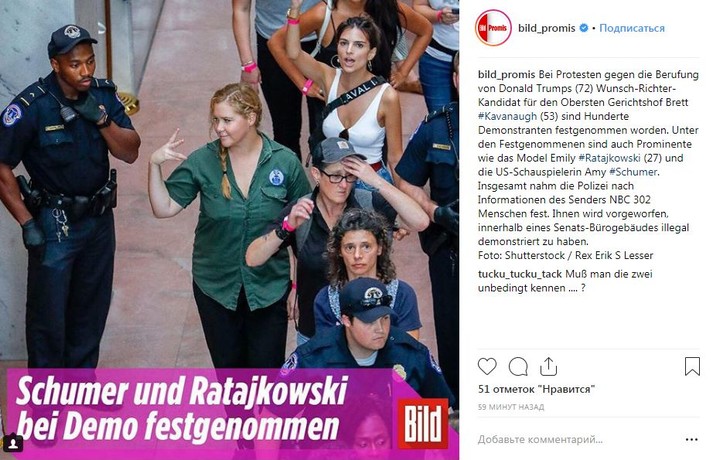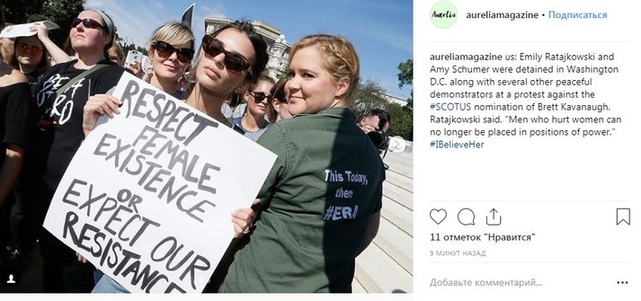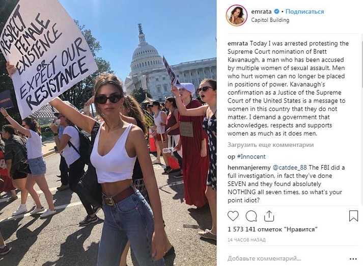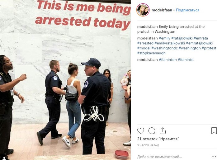 «Сегодня я была арестована во время акции в знак протеста против назначения в Верховный Суд Бретта Кавано, человека, которого обвинили в сексуальном насилии несколько женщин. Мужчины, причиняющие боль женщинам, не могут больше занимать руководящие должности. Назначение Кавано на пост судьи Верховного суда Соединенных Штатов — послание женщинам этой страны о том, что они не имеют значения. Я требую от правительства такого же понимая, уважения и поддержки женщин, как и мужчин», - написала Ратаковский в Instagram.