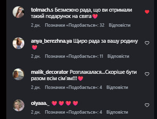 У коментарях українці відреагували на сімейне відео Олени Кравець. Користувачі були раді за родину військового. Також українці, чиї рідні теж стоять на захисті країни, ділилися власними історіями неочікуваних приїздів їхніх захисників: