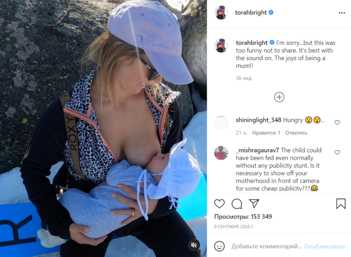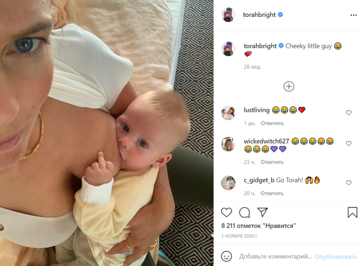 Увидев столь бурную негативную реакцию, Тора призналась, что ей стало грустно. Она отметила, что испытывает огромное уважение ко всем матерям, которые, по ее мнению, должны поддерживать друг друга. И уточнила, что выложила фото вовсе не ради повышения популярности.