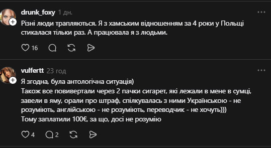 - «Вони завжди до нас так відносились, а останнім часом так взагалі, таке враження, що ми ворог № 1».«Я згодна, була аналогічна ситуація. Також усе повивертали через 2 пачки сигарет, які лежали в мене в сумці, завели в яму, орали про штраф, спілкувалась із ними Українською – не розуміють, англійською – не розуміють, перекладач не хочуть.Тому заплатили 100€, за що, досі не розумію».