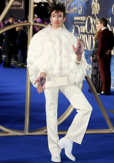 Для премьеры той же картины в Лондоне Миллер выбрал белоснежный total look из коллекции Givenchy Couture осень-зима 2018/19. Наряд состоял из белых брюк и объемного пиджака, расшитого перьями, напоминая образ совы Букли из фильмов о Гарии Поттере. Дополнил образ актер написанным заклинанием на ладонях – «Авада Кедавра».