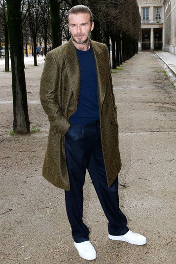 Белые кеды – главный гость в гардеробе Бекхэма, модник надевает их как со свободными брюками и oversized-свитером, так и с классическим костюмом двойкой, придавая образу непринужденности.