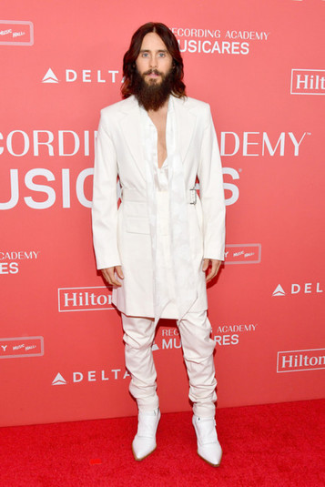 Заключительным аккордом стали длинные волосы Лето, создавая образ хиппи из 70-х годов, который музыканту и fashion-инфлюенсеру очень к лицу.
