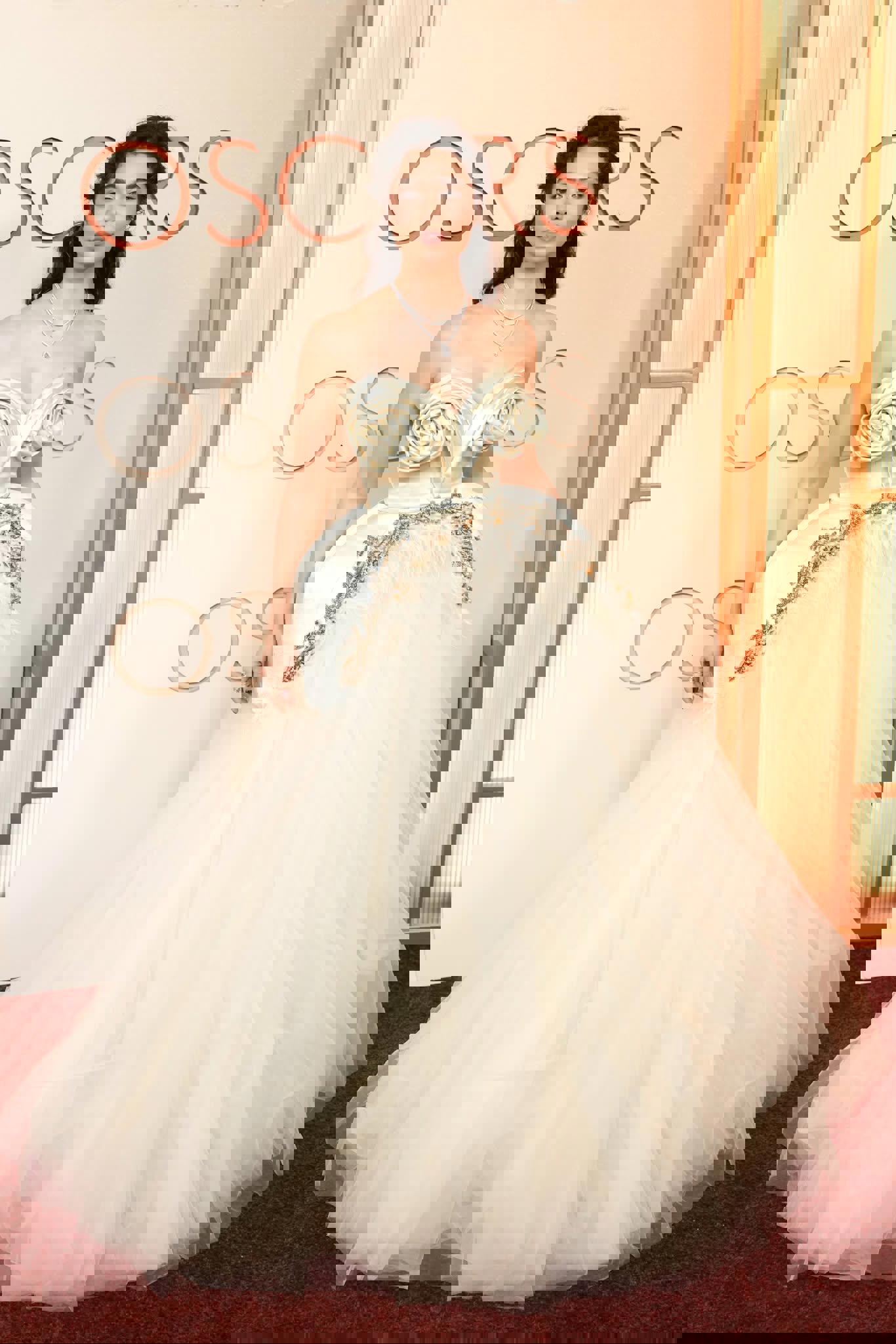 Акторка Аулі’ї Кравальйо обрала пишну бальну сукню кольору слонової кістки з об’ємною декоративною деталлю на ліфі.
